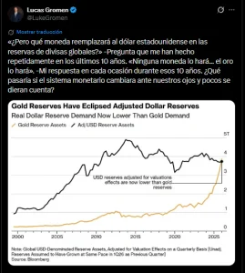 Por otro lado, analistas como Luke Gromen señalan un trasfondo geopolítico: ante el uso del dólar como mecanismo de sanción por parte de Occidente diversas naciones aceleran la diversificación de sus carteras hacia activos que no dependen de un gobierno emisor. “No existe una moneda que pueda reemplazar al dólar; el oro simplemente ocupará su lugar”, sostiene Gromen.