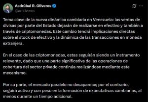 Oliveros enfatiza que las criptomonedas seguirán siendo relevantes en Venezuela. Fuente: @aroliveros – X.