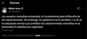 Eli Nagar, CEO de Braiins Mining, advierte que «la UE prohibirá cuentas de criptomonedas anónimas para julio 2027. Toda transacción superior a 1.000 euros necesitará tu ID. La privacidad se extingue».