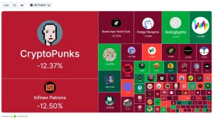 Los precios mínimos entre las principales colecciones de NFT reflejaron la desaceleración general del mercado, con la mayoría de los 10 principales proyectos por capitalización de mercado registrando caídas de dos dígitos en los últimos 30 días.