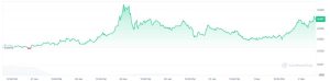 En el caso de HYPE, el token de un exchange descentralizado (DEX) con red propia, su cotización pasó de 22,12 a 31 dólares, lo que representa una subida cercana al 40% en la última semana, tal como se observa en el siguiente gráfico: