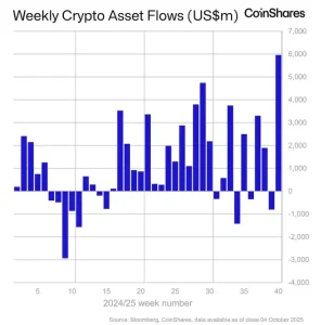 Los productos de inversión basados en activos digitales experimentaron la mayor entrada de capital semanal de su historia, alcanzando los 5.950 millones de dólares la semana pasada.