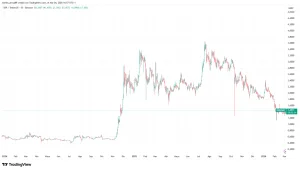 Al momento de la redacción de artículo, 4 de marzo de 2026, XRP se negocia en torno a 1,45 dólares, un 60% debajo de su ATH, tal como se observa en el siguiente gráfico: